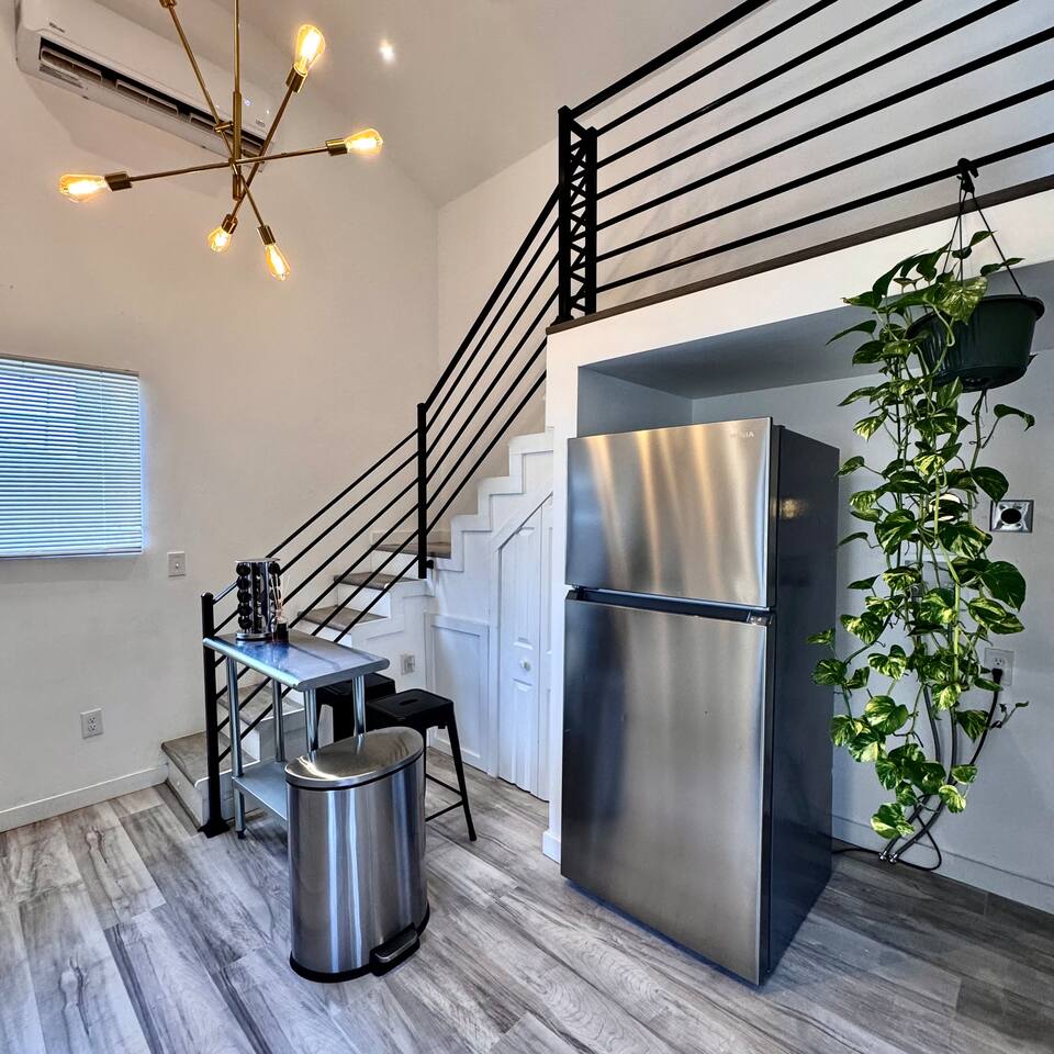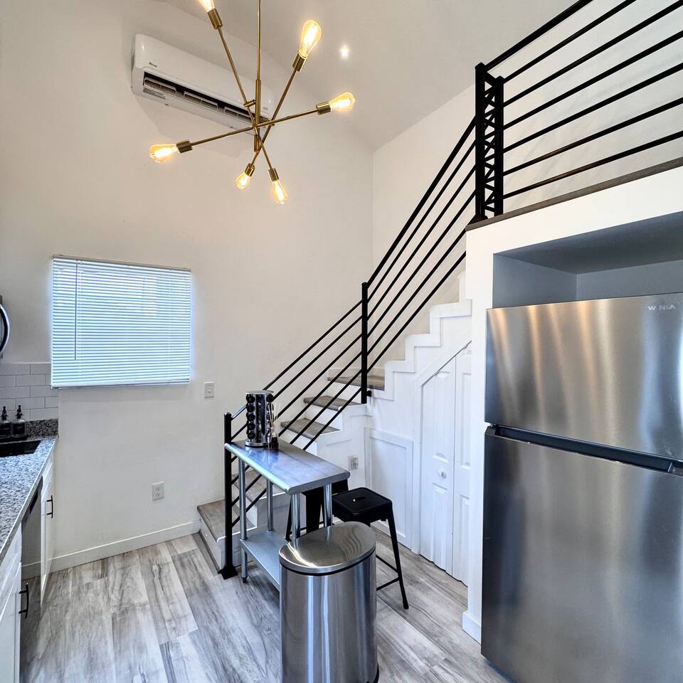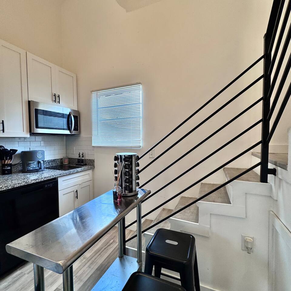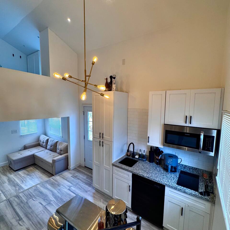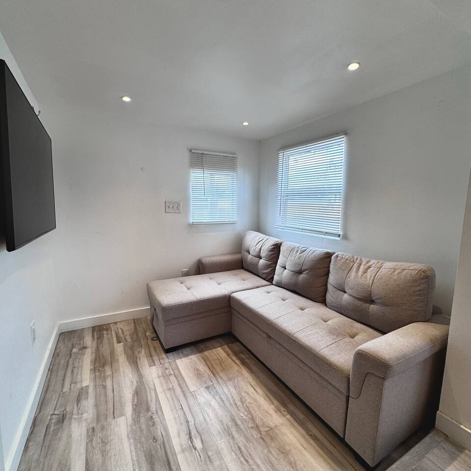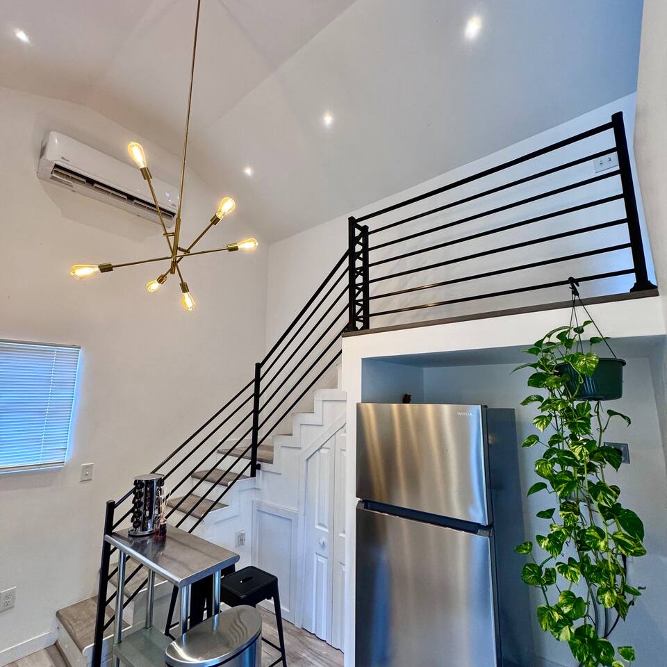 THE SPACE LIVING AREA A spacious and cozy area designed for your comfort. Relax on the sofa bed while enjoying a large Smart TV, perfect for watching your favorite sports or movies. KITCHEN A modern-design kitchen with everything you need to feel at home. Fully equipped with a microwave, glass cooktop, coffee maker, and refrigerator. We also provide coffee, sugar, and creamer to start your day right. The kitchen includes a breakfast bar for two. BEDROOM Located on the second floor, this bedroom is your private retreat. It features a comfortable queen-size bed, a wardrobe, and a cozy window seat with a garden view, perfect for reading, relaxing, or simply enjoying the atmosphere. COVERED DECK Enjoy a spacious private deck, perfect for unwinding and creating unforgettable moments. Equipped with a charcoal grill, a large table for meal preparation, and a surrounding bench, this space is ideal for hosting a barbecue, having breakfast outdoors, sipping your morning coffee, or simply spending time in a peaceful and inviting environment. The perfect spot to connect with nature without leaving home! A space designed to offer the best experience in New Orleans. We look forward to hosting you!